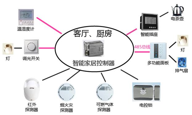 智能電子產品系統(tǒng)網(wǎng)絡示意圖 1. 家庭控制中心說明: 客廳廚房控制中心 客廳廚房控制中心包含智能家居控制器、電控鎖、多功能面板、節(jié)能燈、排氣扇、智能調光開關、智能光強及溫濕度計、智能插座、電茶壺、可燃氣體探測器、煙火災探測器及紅外探測器。 電控鎖通過智能家居控制器控制門的開啟;多功能面板控制客廳、廚房燈的開關;智能調光開關調節(jié)LED燈的亮度、也可通過485總線與智能家居控制器通訊,通過情景模式智能調節(jié)LED燈的亮度;智能光強及溫濕度計顯示采集客廳溫濕度及光照度;智能插座控制和采集電茶壺的電源和電量信息,可合理分配用電負荷;可燃氣體探測器、煙火災探測器及紅外探測器用于組件家居系統(tǒng)的安防系統(tǒng)。 多功能面板、智能調光開關、智能光強及溫濕度計、智能插座通過485總線與智能家居控制器通訊,可燃氣體探測器、煙火災探測器、紅外探測器及電控鎖通過I\O口與智能家居控制器通訊。