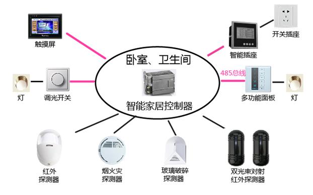 智能電子產品系統(tǒng)客廳廚房安裝配置圖 臥室衛(wèi)生間控制中心 臥室衛(wèi)生間控制中心包含智能家居控制器、觸摸屏、多功能面板、智能調光開關、智能插座、煙火災探測器、紅外探測器、玻璃破碎探測器、雙光束對射紅外探測器。 觸摸屏通過485與智能家居控制器通訊,可實現(xiàn)遙控、遙信、遙調及情景模式的設定;智能調光開關調節(jié)白熾燈的亮度、也可通過485總線與智能家居控制器通訊,通過情景模式智能調節(jié)白熾燈的亮度;多功能面板控制臥室、衛(wèi)生間燈的開合;智能插座控制和采集相關用電設備電源和電量信息,可合理分配用電負荷;煙火災探測器、紅外探測器、玻璃破碎探測器、雙光束對射紅外探測器用于組件家居系統(tǒng)的安防系統(tǒng)。 觸摸屏、多功能面板、智能調光開關、智能插座通過485總線與智能家居控制器通訊,煙火災探測器、紅外探測器、玻璃破碎探測器及雙光束對射紅外探測器通過I\O口與智能家居控制器通訊。